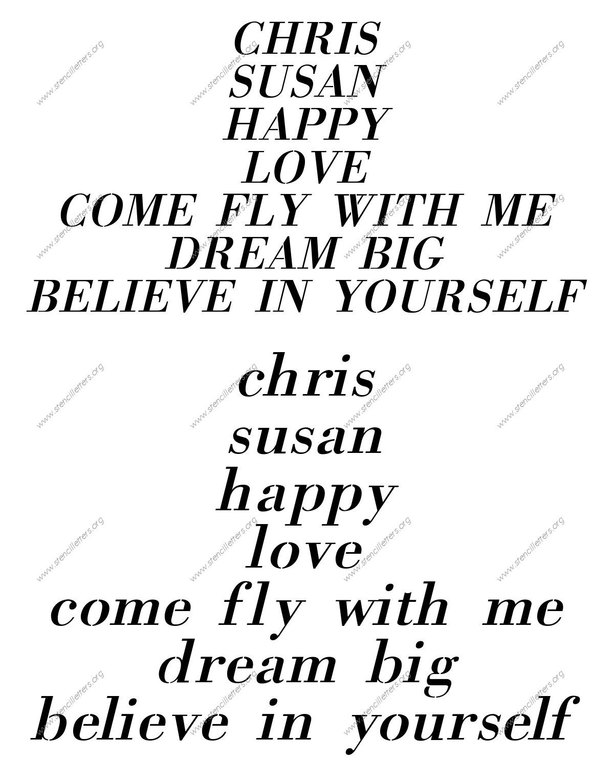 A 1700s themed italic stencil featuring elegant and feminine style lines for your own customized words, names and phrases in stencil.