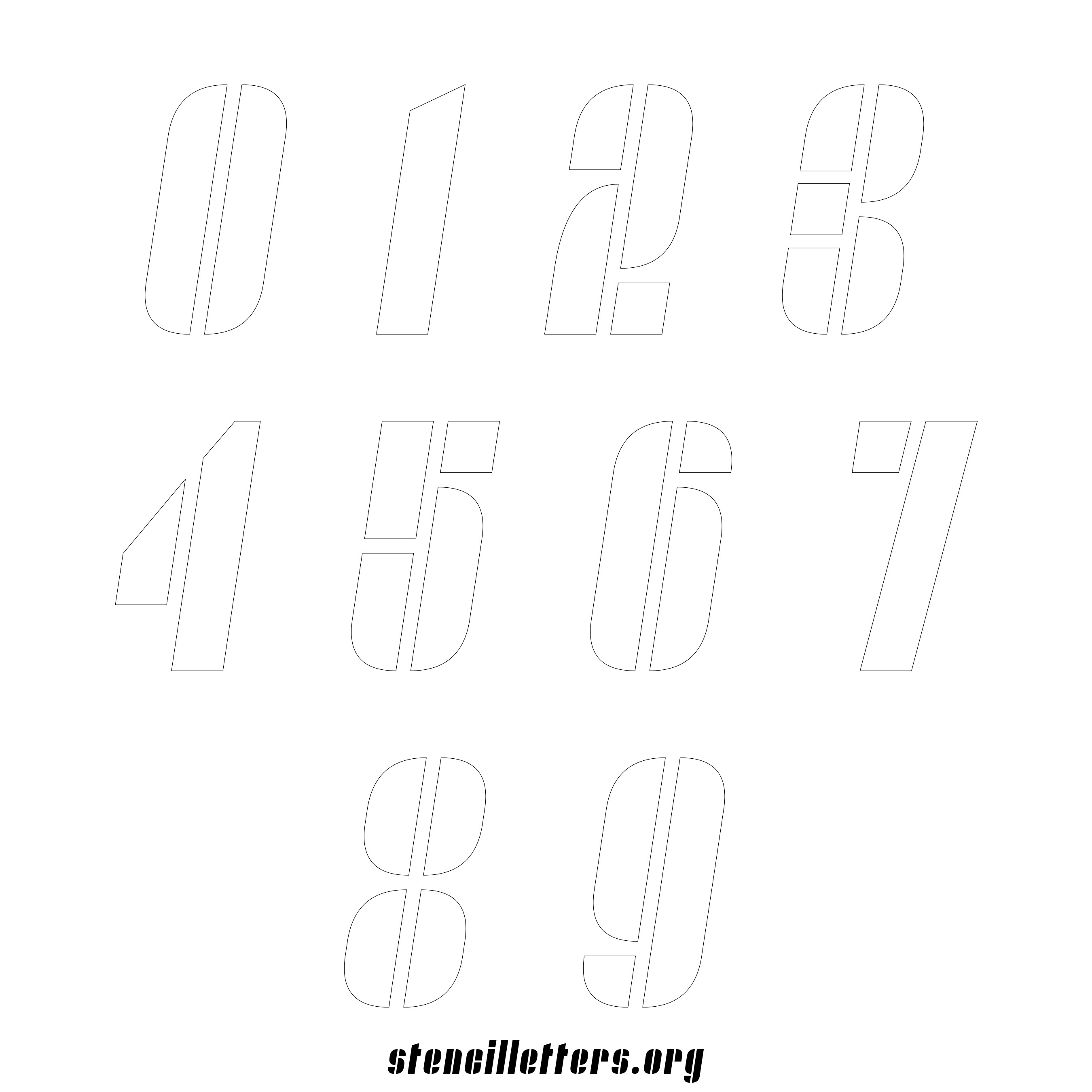 Stencil Design 257 Slanted. Print these free numbers stencils and make your own DIY templates for your stenciling projects. Available in high resolution printable sizes: 4 Inch, 5 Inch, 6 Inch, 7 Inch, 8 Inch, 9 Inch and 10 Inch.