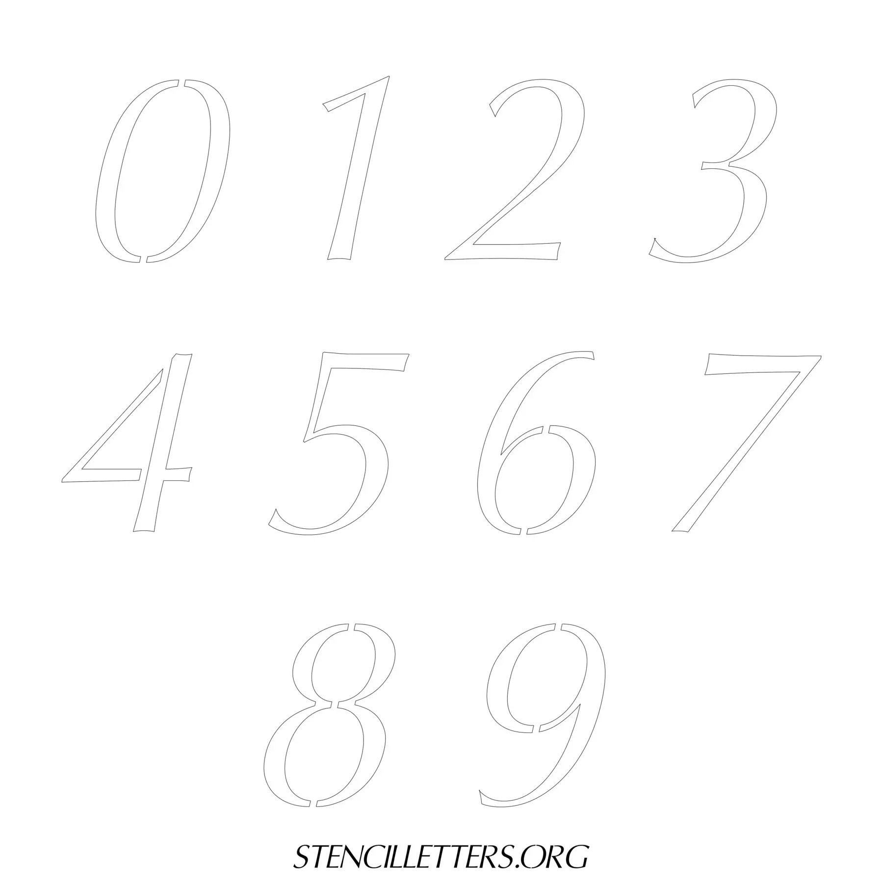Stencil Design 38 Italic. Print these free numbers stencils and make your own DIY templates for your stenciling projects. Available in high resolution printable sizes: 4 Inch, 5 Inch, 6 Inch, 7 Inch, 8 Inch, 9 Inch and 10 Inch.