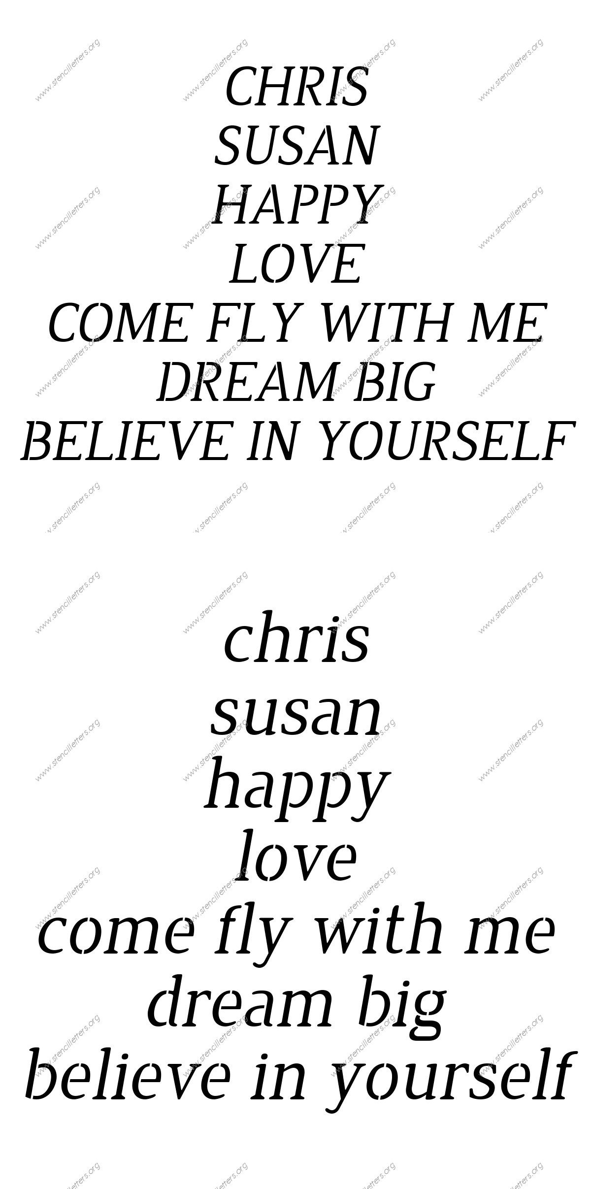 Narrow Rounded Serif Italic Custom Template made to order stencils up to 36 inch Printable File Size. This Narrow Rounded Serif Italic custom stencil design is from our selection of over 100 unique stencils listed in the {Custom Made Stencils} section.